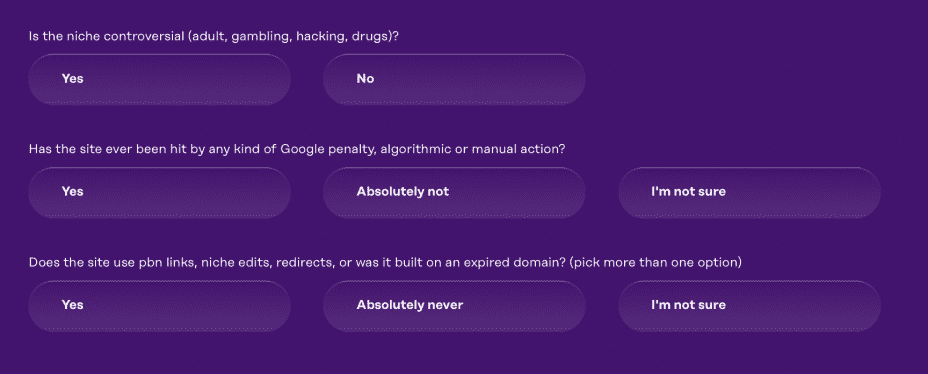 At this stage, you can also tell us whether the site is built on an expired domain or if it uses pbn links, niche edits, or redirects.